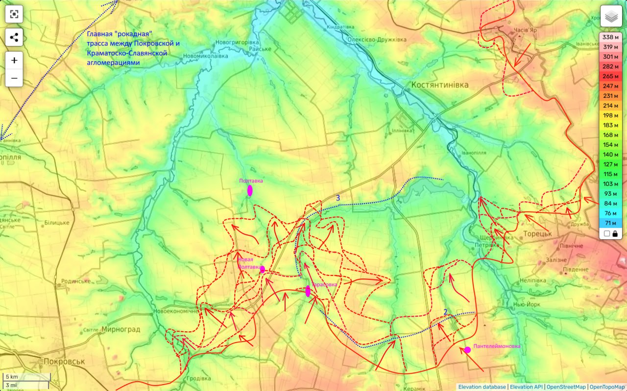 Они также сообщают, что цель войск РФ на этом участке - движение на северо-запад, что позволит дронам активнее бить по рокадной дороге между Покровском и районом Краматорска. Для этого российским войскам нужно прорвать линию Полтавка - Попов Яр - Русин Яр, за которую уже начались бои.