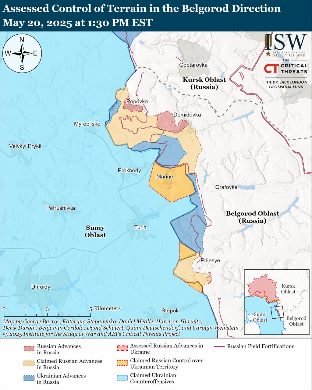 Кроме того, РФ удерживает участки местности севернее села Владимировка в Сумской области глубиной до 1,2 км (западнее Водолаг) и в районе Александровского гидрологического заказника глубиной до 1,7 км (северо-восточне Сум, через границу от курского села Гуево).