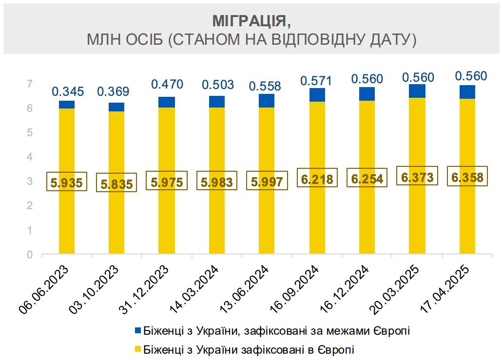 В Европе на 16 декабря 2024 года было 6,254 миллиона граждан Украины, а по состоянию на 17 апреля 2025 года - уже 6,358 миллиона человек. При этом количество беженцев за пределами Европы остается прежним - 560 тысяч человек.