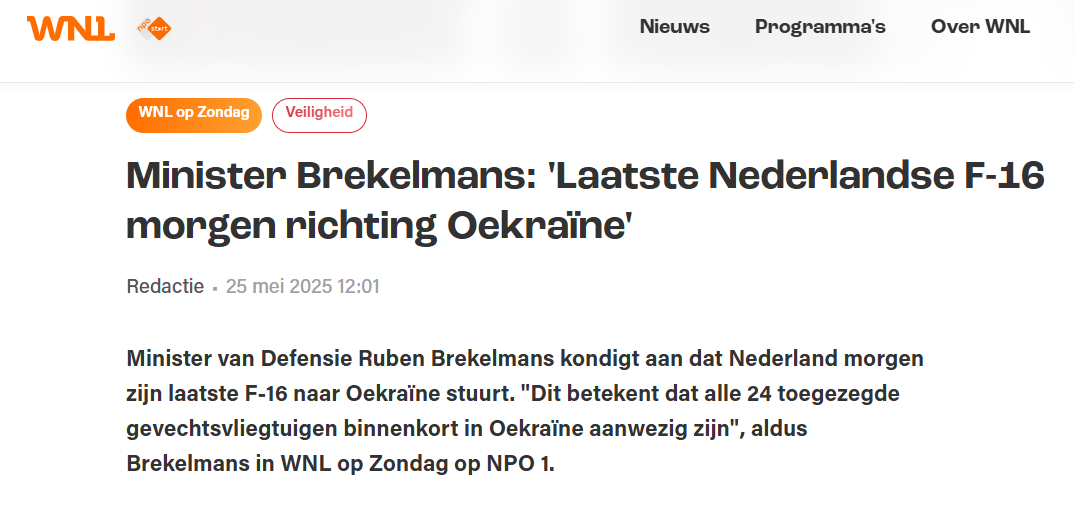 Завтра Нидерланды передадут Украине последний истребитель F-16 из 24, которые были обещаны ранее.  Об этом заявил министр обороны Рубен Брекельманс во время интервью изданию WNL.