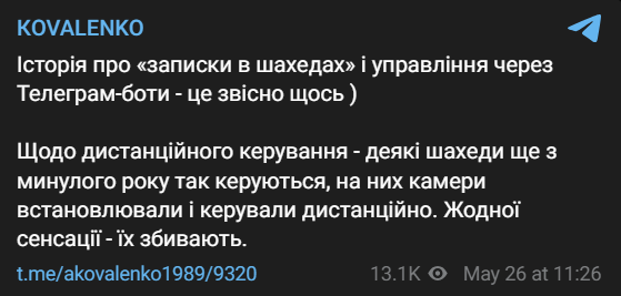 "История о записках в "Шахедах" и управлении через телеграм-боты – это, конечно, что-то. Относительно дистанционного управления – некоторые "Шахеды" еще с прошлого года так управляются, на них камеры устанавливали и управляли дистанционно. Никакой сенсации – их сбивают", - написал Коваленко.