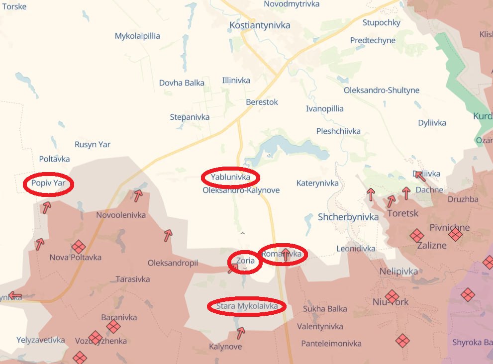 На Константиновском направлении российская армия зашла в Попов Яр, взяла под контроль часть Яблоневки и Зари, а также полностью овладела Старой Николаевкой и Романовкой.