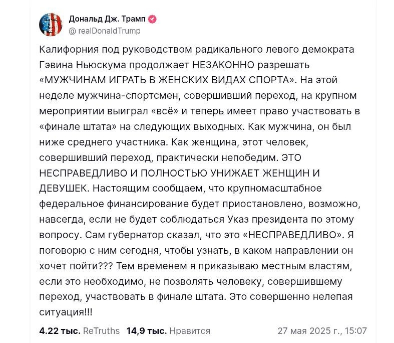 "На этой неделе мужчина-спортсмен, совершивший переход, на крупном мероприятии выиграл "все" и теперь имеет право участвовать в "финале штата" на следующих выходных. Как мужчина, он был ниже среднего участника. Как женщина, этот человек, совершивший переход, практически непобедим… Настоящим сообщаем, что крупномасштабное федеральное финансирование будет приостановлено, возможно, навсегда, если не будет соблюдаться указ президента по этому вопросу", - написал американский лидер в социальной сети Truth Social.
