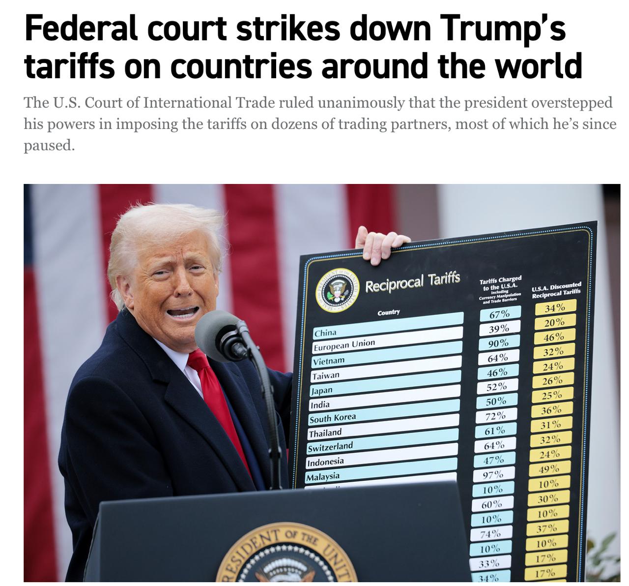 Незаконными признаны и "взаимные" тарифы в размере от 20 до 50 процентов для 60 с лишним торговых партнеров, которые должны вступить в силу 9 июля - если иностранные правительства не смогут достичь соглашения с Белым домом до этого времени.