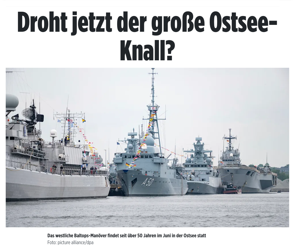 На следующей неделе страны НАТО начнут военно-морские учения Baltops, что проводятся в начале июня уже более 50 лет. РФ тоже отправляет свой флот на учения – в этот раз на месяц раньше обычного. В манёврах примут участие 20 российских кораблей. Эксперты предупреждают, что в ходе выполнения учебных задач эскадрильи сторон могут опасно сблизиться.