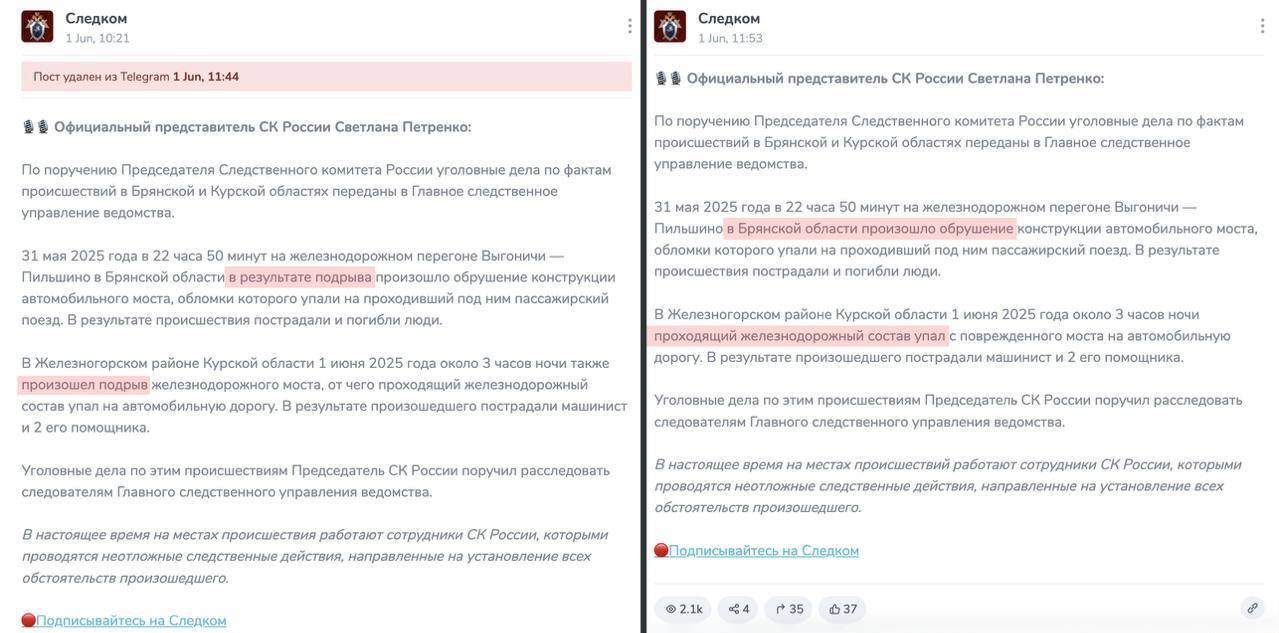 Позже российский следственный комитет отредактировал свое сообщение об инцидентах на железной дороге в Брянской и Курской областях - оттуда исчезло упоминание того, что это произошло вследствие подрывов.