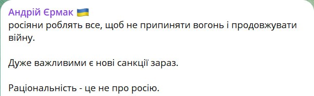 "Россияне делают все, чтобы не прекращать огонь и продолжать войну. Очень важны новые санкции сейчас. Рациональность – это не о России", – написал он.