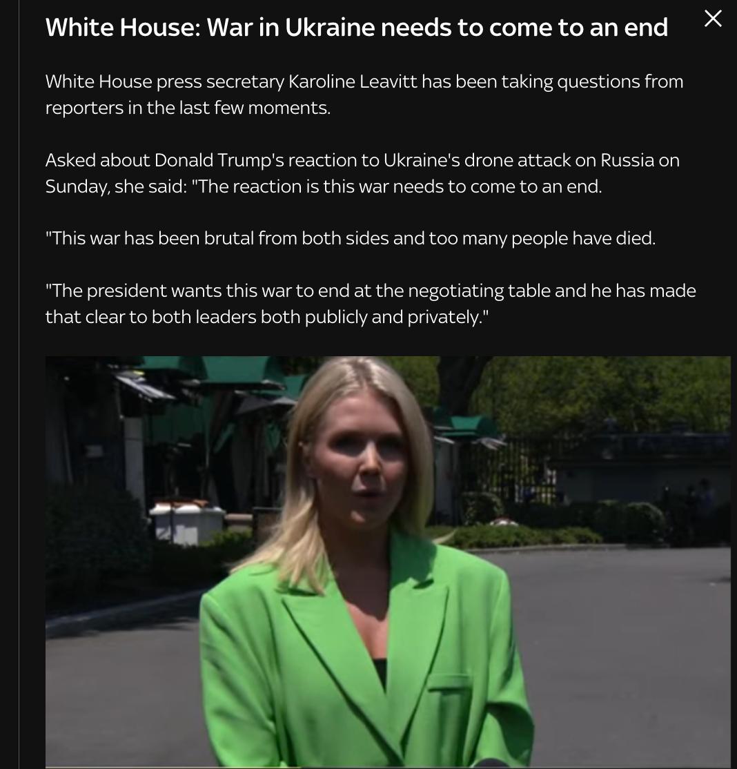 "Реакция (Трампа) заключается в том, что этой войне нужно положить конец. Эта война была жестокой с обеих сторон, и слишком много людей погибло. Президент хочет, чтобы эта война закончилась за столом переговоров, и он ясно дал это понять обоим лидерам как публично, так и в частном порядке", – заявила пресс-секретарь Белого дома Кэролайн Ливитт.
