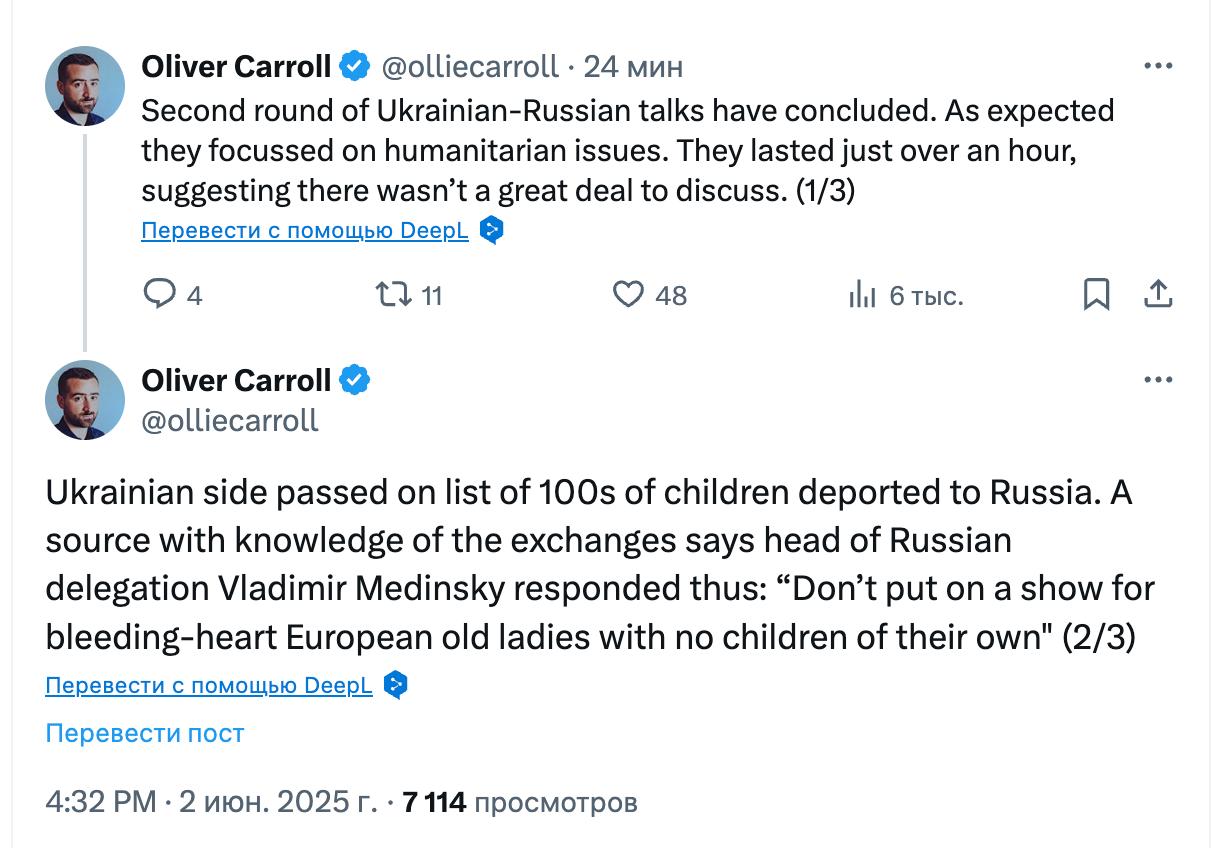 16:59 Глава российский делегации Мединский назвал "шоу для европейских старушек"  украинский призыв на переговорах в Стамбуле вернуть более сотни вывезенных в РФ детей, сообщает журналист The Economist Оливер Кэрролл со ссылкой на источник.