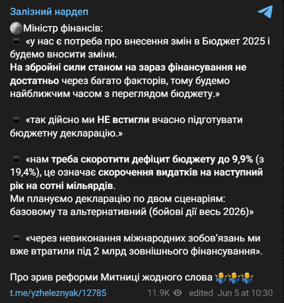 При этом Железняк не пишет, уточнил ли министр объем дефицита и предлагаемые способы его компенсации.