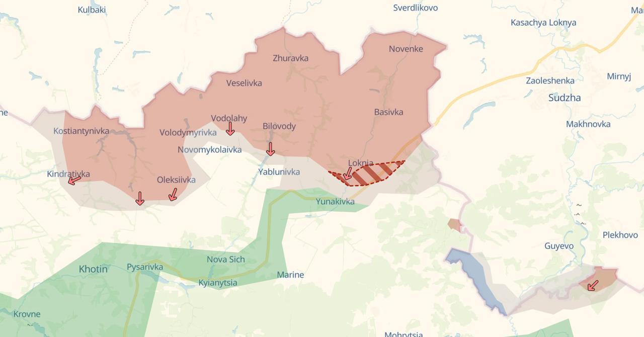 Сложная ситуация складывается и на участке Новониколаевка-Варачино-Яблоновка-Юнаковка, где российские военные пытаются занять населенные пункты и закрепиться, несмотря на значительные разрушения в Юнаковке. В районе Локни ВС РФ пытаются продвигаться восточнее села в леса в направлении Садков, что создает серьезные сложности для его вытеснения.
