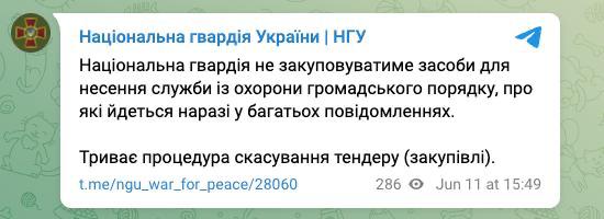 "Национальная гвардия не будет закупать средства для несения службы по охране общественного порядка. Тендер на соответствующую закупку отменен", - сказано в сообщении.