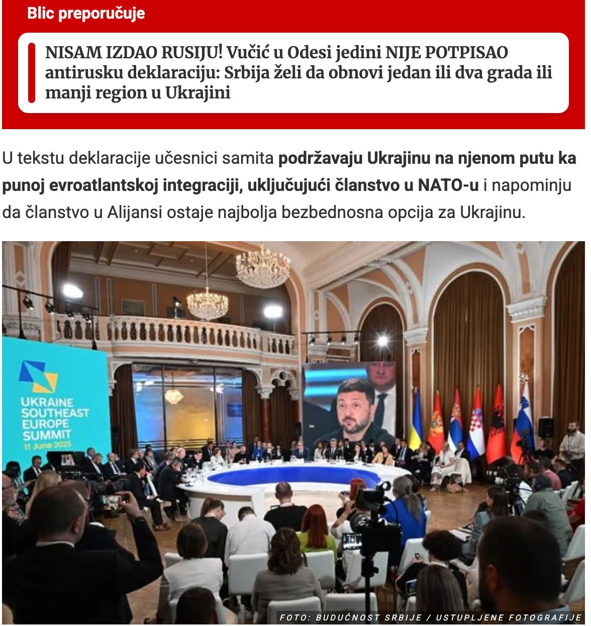 В то же время, как сообщает газета Le Monde, президент Сербии отказался подписать итоговое заявление саммита "Украина - Юго-Восточная Европа", осуждающее российскую агрессию против Украины.
