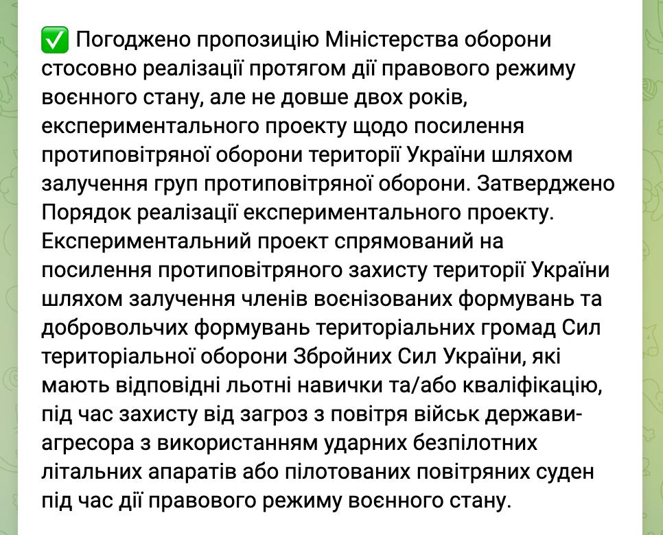 Накануне Кабмин сообщил, что согласовал предложение Минобороны по запуску "экспериментального проекта" с привлечением к ПВО "членов военизированных формирований и добровольческих формирований территориальных общин Сил территориальной обороны ВСУ". Платить обещают по 100 тыс. грн в месяц.