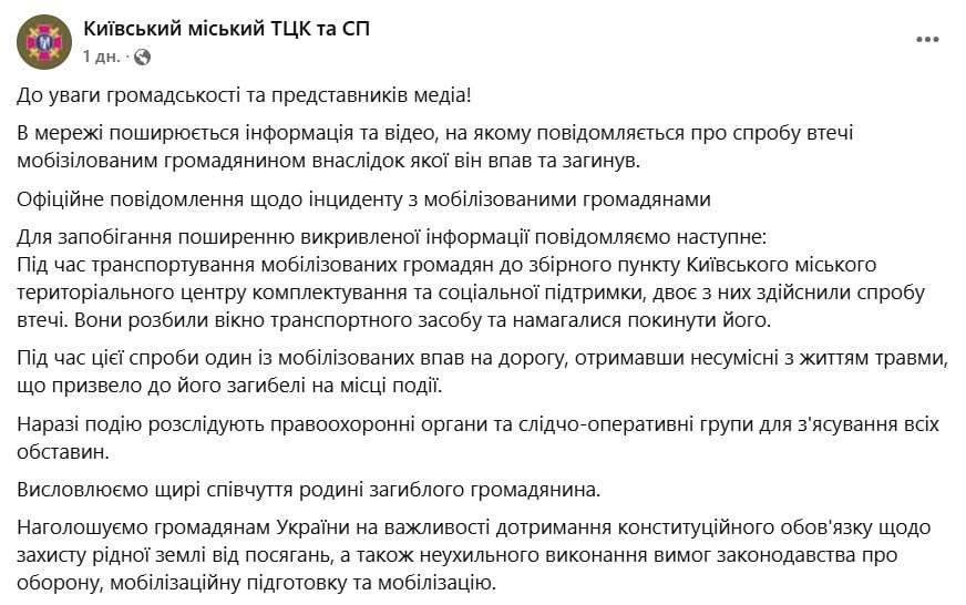 В Киеве при попытке сбежать из автомобиля военкомов погиб мобилизованный мужчина.