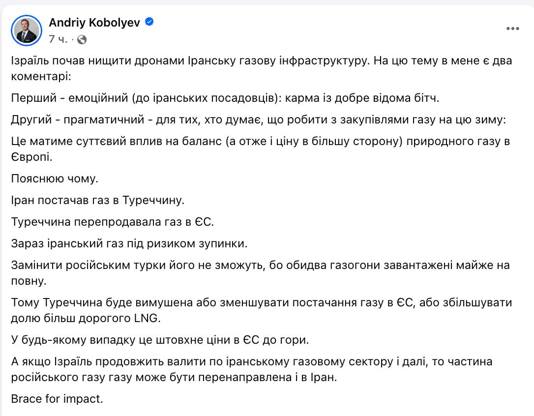 Бывший глава "Нафтогаза" Андрей Коболев прогнозирует рост европейских цен на газ из-за ударов по иранским газовым мощностям.