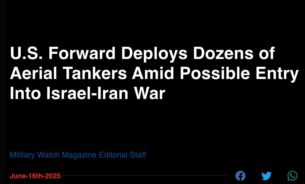 США перебрасывают свои самолеты-заправщики KC-135 и KC-46 через Атлантический океан в "беспрецедентно массовом" масштабе. Возможно, это происходит для участия американской армии в войне Израиля и Ирана.