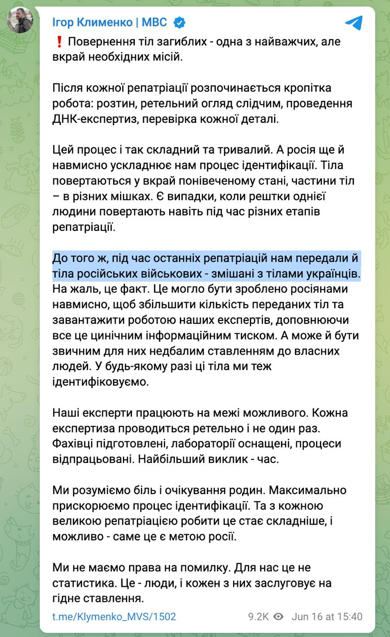 "Во время последних репатриаций нам передали и тела российских военных, смешанные с телами украинцев. Это могло быть сделано россиянами намеренно, чтобы увеличить количество переданных тел и загрузить работой наших экспертов, дополняя все это циничным информационным давлением. А может и быть привычным для них небрежным отношением к собственным людям. В любом случае эти тела мы тоже идентифицируем", - написал глава МВД.