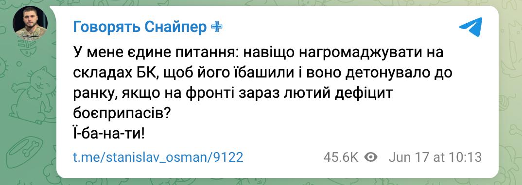 "У меня единственный вопрос: зачем накапливать на складах БК, чтобы его взрывали и он детонировал до утра, если на фронте сейчас острый дефицит боеприпасов?" - написал Бунятов.