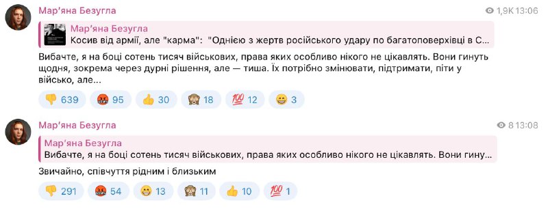 "Извините, я на стороне сотен тысяч военных, права которых никого особо не интересуют. Они погибают каждый день, в частности из-за глупых решений, но — тишина. Их нужно менять, поддержать, уйти в армию, но... Конечно, соболезнования родным и близким", - написала Безуглая.