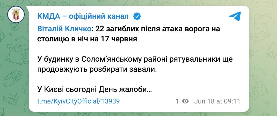 9.14 В Киеве 22 погибших после вчерашней ночной атаки РФ, сообщают столичные власти.