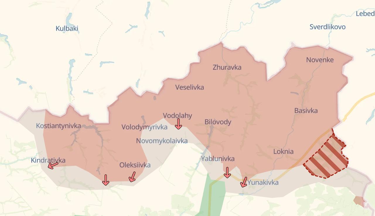 Российские войска продвинулись восточнее Юнаковки Сумской области. Об этом свидетельствует карта военного паблика Deep State.