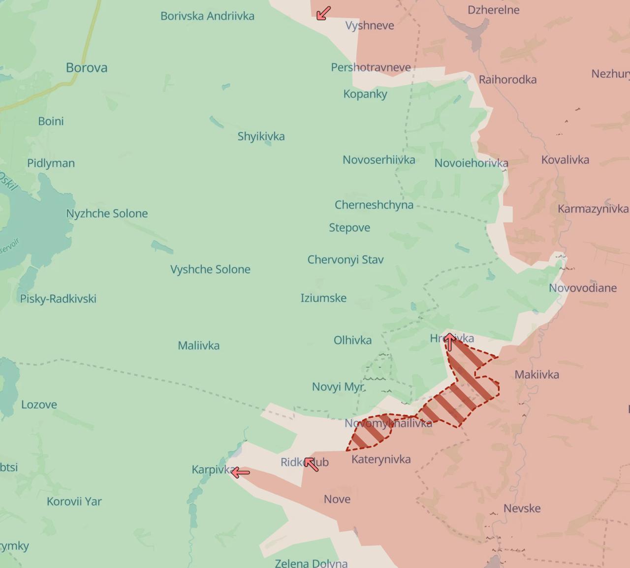 08:51 Российские войска продвинулись в направлении Боровой - по линии Новомихайловки (захвачена), Радковки и Грековки. Об этом сообщает военный паблик Deep State.