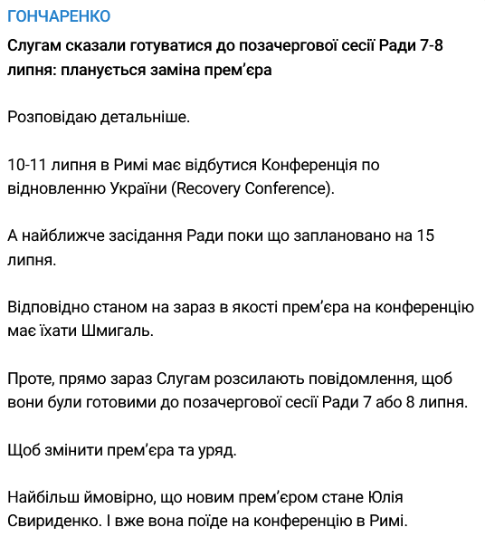 Как и ранее сообщалось, вероятной сменщицей Шмыгаля Гончаренко называет Юлию Свириденко. И уже она поедет на конференцию в Риме в новом статусе.