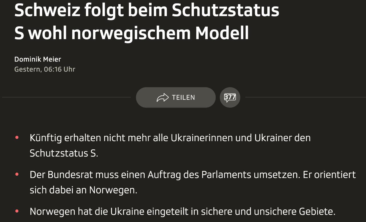 Напомним, ранее Швейцарская народная партия (ШНП) внесла в Национальный совет предложение ужесточить предоставление статуса защиты S для украинских беженцев, аргументируя это тем, что ситуация на значительной части территории Украины стабилизировалась и там нет боевых действий.
