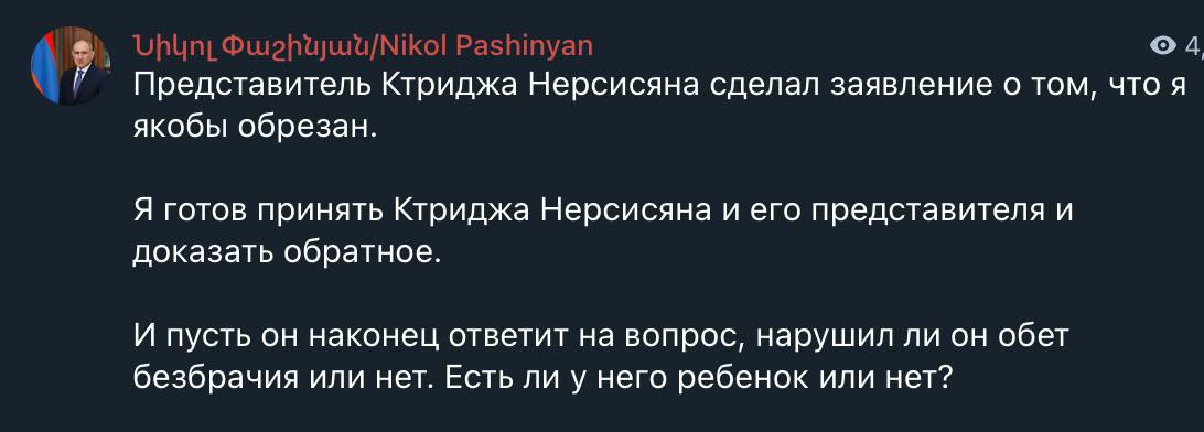 Слухи об обрезании. Пашинян хочет показать свой половой орган патриарху Армянской апостольской церкви