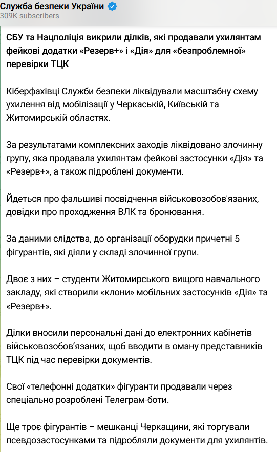 По информации СБУ, двое студентов житомирского вуза создали "клоны" мобильных приложений "Дия" и "Резерв+", а трое жителей Черкасской области организовали их продажу желающим в столице, а также в Черкасской, Киевской и Житомирской областях.