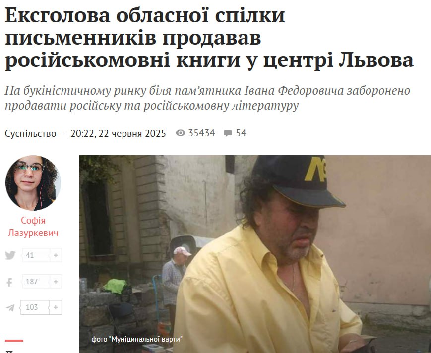 Среди тех, кого выловили участники объединения, оказался писатель и экс-председатель Львовской областной организации Национального союза писателей Украины Игорь Гургула, выставивший на продажу около 100 экземпляров русскоязычных книг.