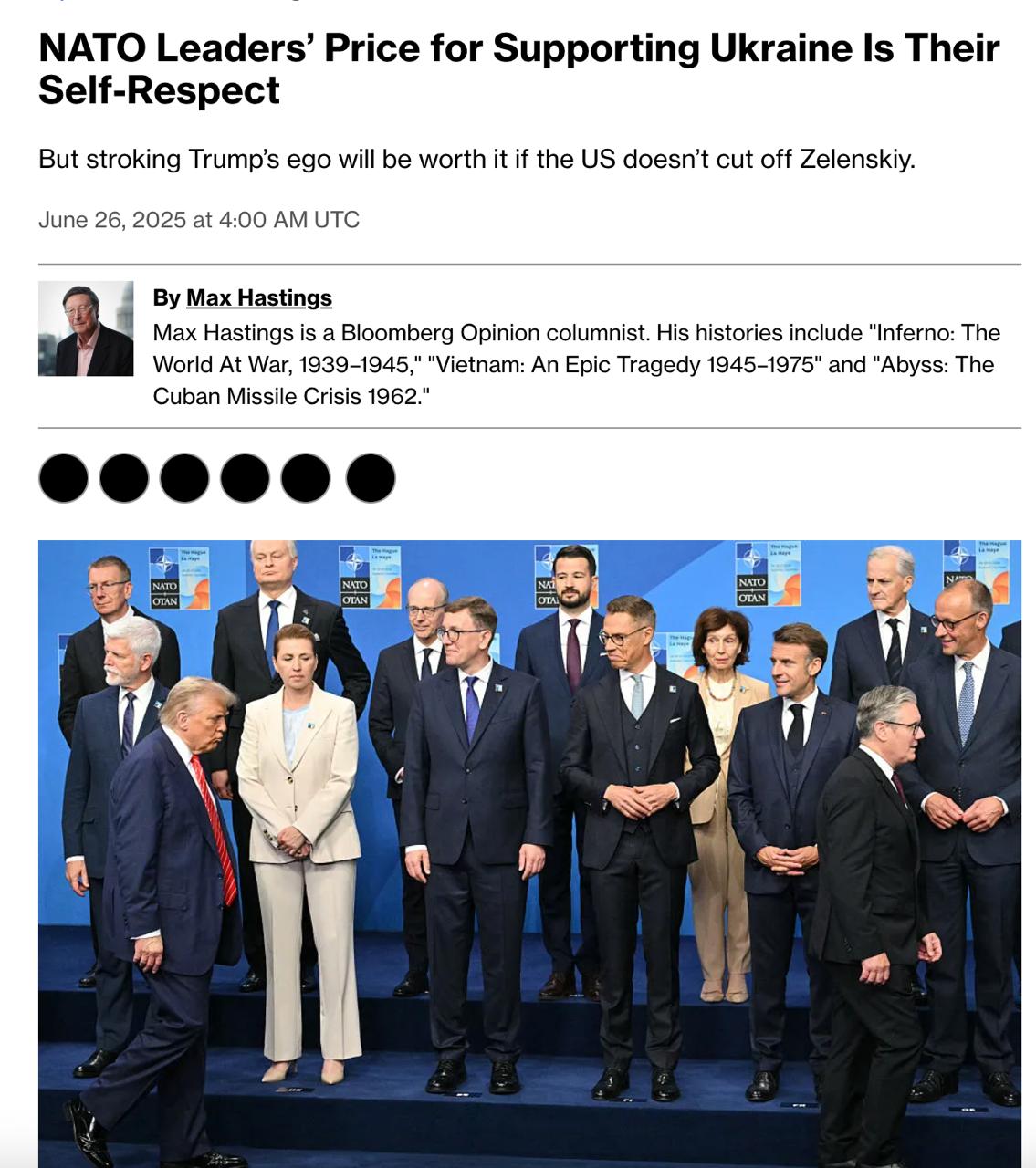 Колумнист Bloomberg Макс Гастингс назвал саммит "праздником любви с единственной целью: помешать самому импульсивному и эксцентричному президенту США в истории выбросить игрушки НАТО из своей коляски".