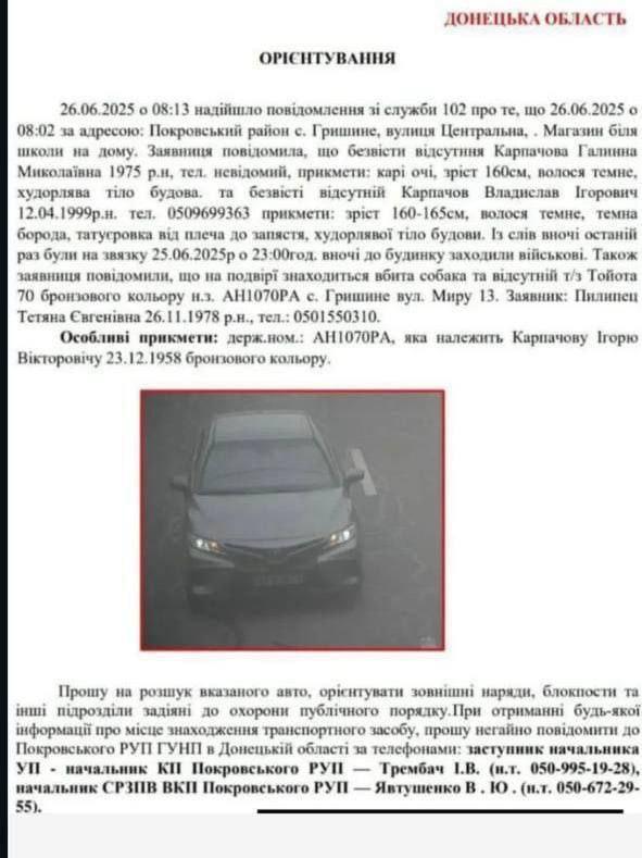 Телеграм-каналы также публикуют ориентировку по делу погибших матери и сына. В документе, датированном 26 июня, говорится, что в 08:13 в полицию поступило сообщение об исчезновении двух человек - Галины Карпачевой 1975 года рождения и Владислава Карпачева 1999 года рождения. Женщина, по словам заявительницы, не вернулась домой из школы, а её сын перестал выходить на связь накануне, около 23:00. Инцидент произошёл в селе Гришино Покровского района Донецкой области.