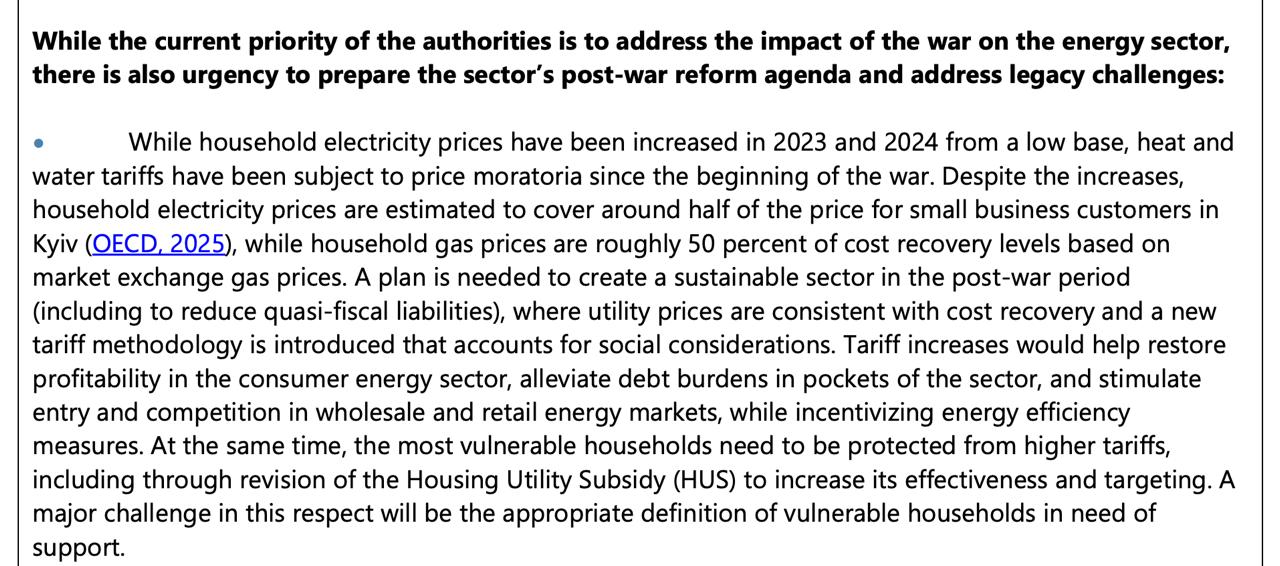 В меморандуме сказано, что несмотря на повышения в 2023 и 2024 годах, "цены на электроэнергию для населения составляют около половины уровня цен для малого бизнеса в Киеве, тогда как цены на газ для населения покрывают примерно 50% затрат на основе рыночных цен на газ".