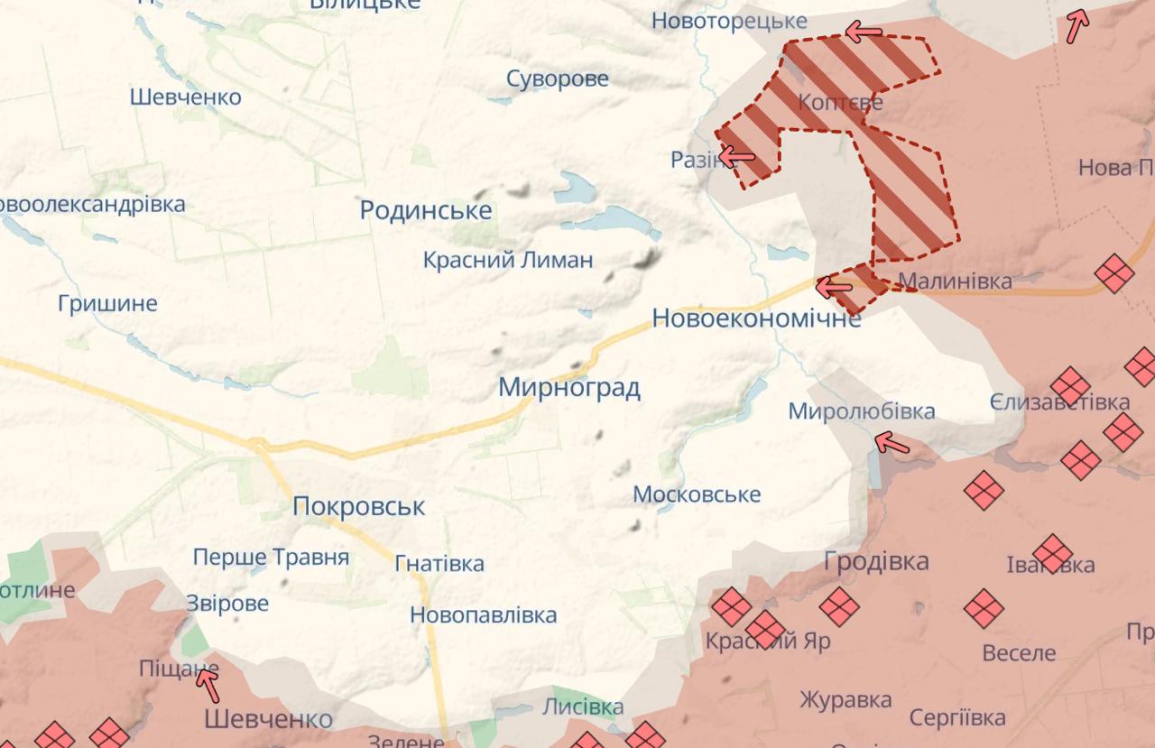 К востоку от Покровска сообщается о потере Коптево, что позволило РФ приблизиться к Мирнограду .