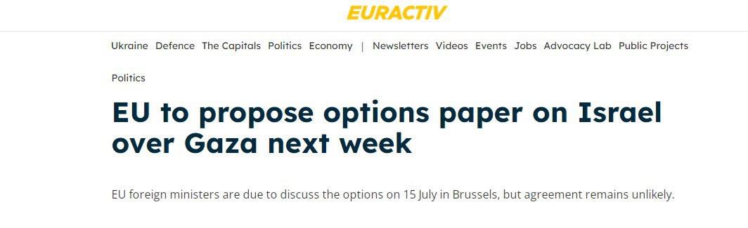Ограничения главы МИД стран ЕС обсудят 15 июля. В этот же день Израиль должен представить отчет об улучшении гуманитарной ситуации в секторе Газа.