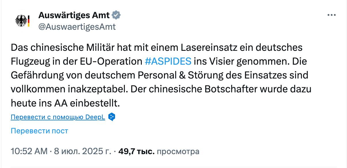 "Китайские военные использовали лазерное оружие против немецкого самолета, участвующего в операции ЕС Aspides (оборонительная морская операция Евросоюза, направленная на обеспечение безопасности в Красном море и других водах, цель которой - защита торговых судов от нападений со стороны йеменских хуситов и обеспечение свободы судоходства в регионе - Ред.). Угроза безопасности немецкого персонала и срыв операции являются совершенно неприемлемыми. Сегодня китайский посол был вызван в МИД Германии для объяснений", - говорится в сообщении МИД.