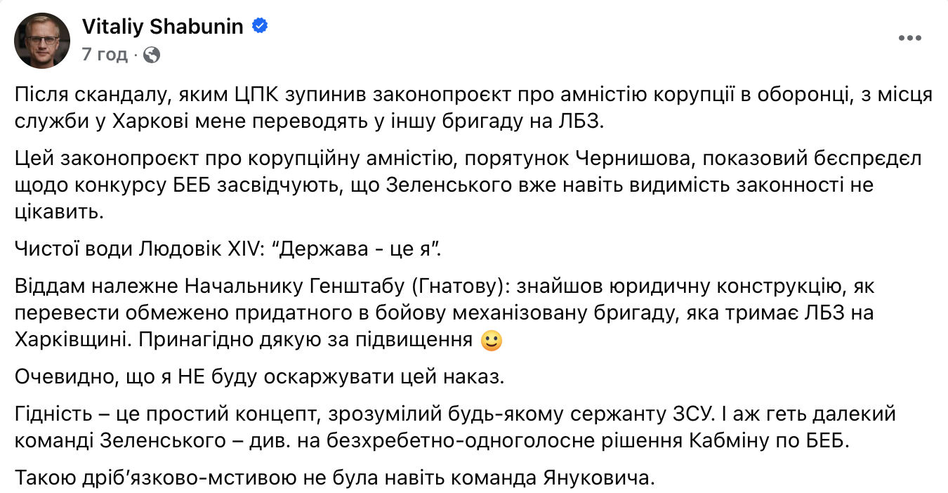 "Этот законопроект о коррупционной амнистии, спасение вице-премьера Алексея Чернышова, показательный беспредел по поводу конкурса БЭБ свидетельствуют, что Зеленского уже даже видимость законности не интересует. Чистой воды Людовик XIV: "Государство – это я". Отдам должное Начальнику Генштаба (Андрею Гнатову): нашел юридическую конструкцию, как перевести ограниченно годящегося в боевую механизированную бригаду, которая держит ЛБО на Харьковщине. Спасибо за повышение", - написал глава ЦПК.
