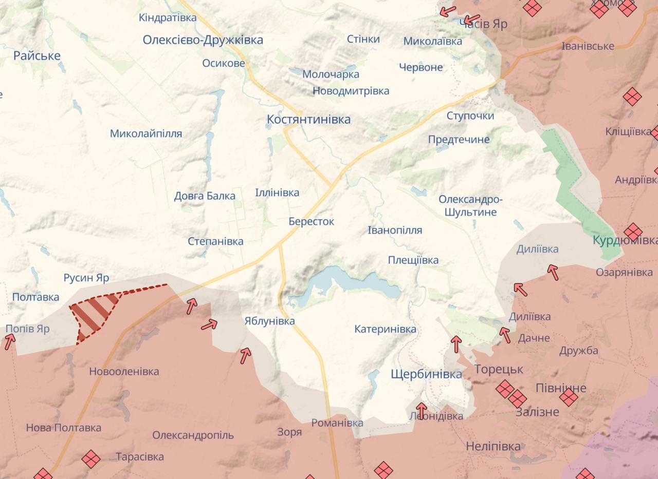 На Константиновском направлении, где также с недавних пор возобновилось регулярное продвижение РФ, россияне заняли новые позиции в направлении Русиного Яра.