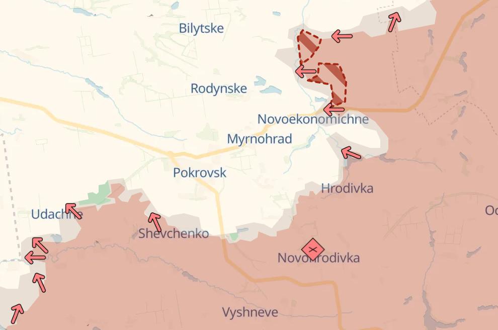 Крупное продвижение РФ зафиксировано и к северо-востоку от Покровска и Мирнограда (по линии Новоторецкое - Новоэкономическое). Там враг вероятно совершает попытки выйти к северу от Покровска.
