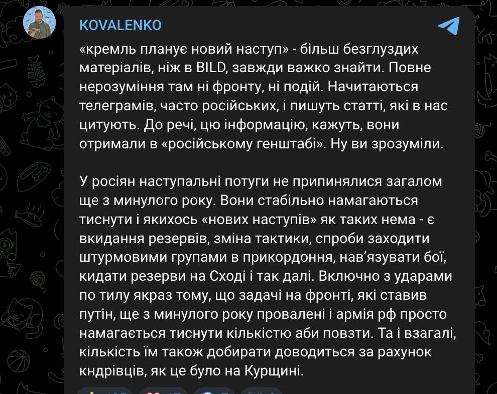 "У россиян наступательные действия, в целом, не прекращались ещё с прошлого года. Они стабильно пытаются давить, и никаких "новых наступлений" как таковых нет - есть переброска резервов, смена тактики, попытки заходить штурмовыми группами на приграничье, навязывать бои, бросать подкрепления на Восток и так далее", - заявил глава ЦПД Андрей Коваленко.