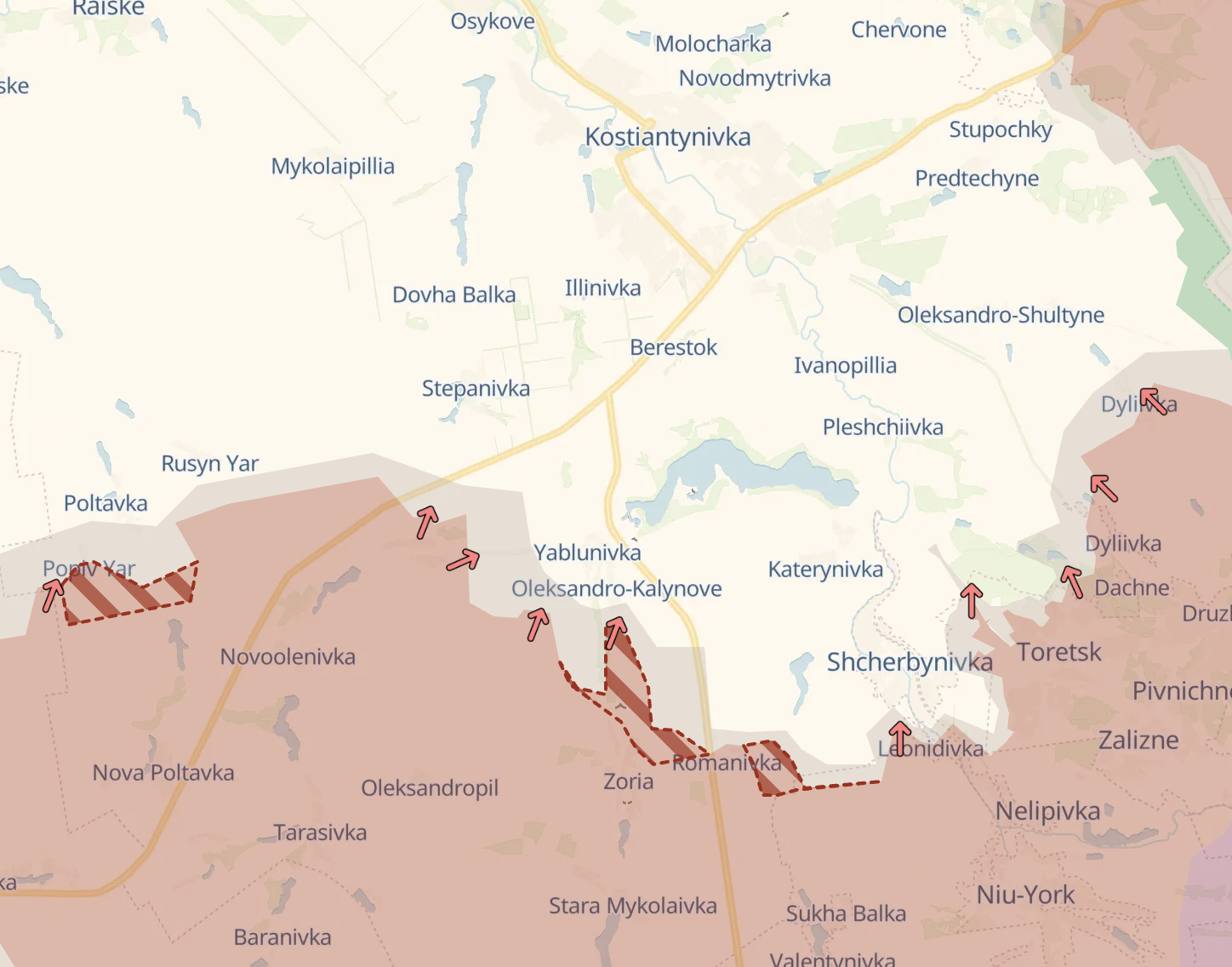 К югу от Константиновки российские силы продвинулись в сторону Александро-Калинового, а также в Романовке и Поповом Яре. Также зафиксировано продвижение в районах Дылеевки и Торецка.