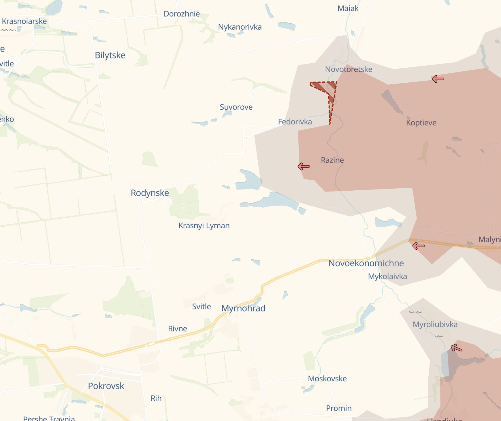 Западнее российские силы продвинулись к северо-востоку от Покровска и Мирнограда — по линии Новоторецкое – Новоэкономическое. Россияне также заняли новые позиции в районе Бойковки и в сторону села Суворово. Захвачено село Разино.