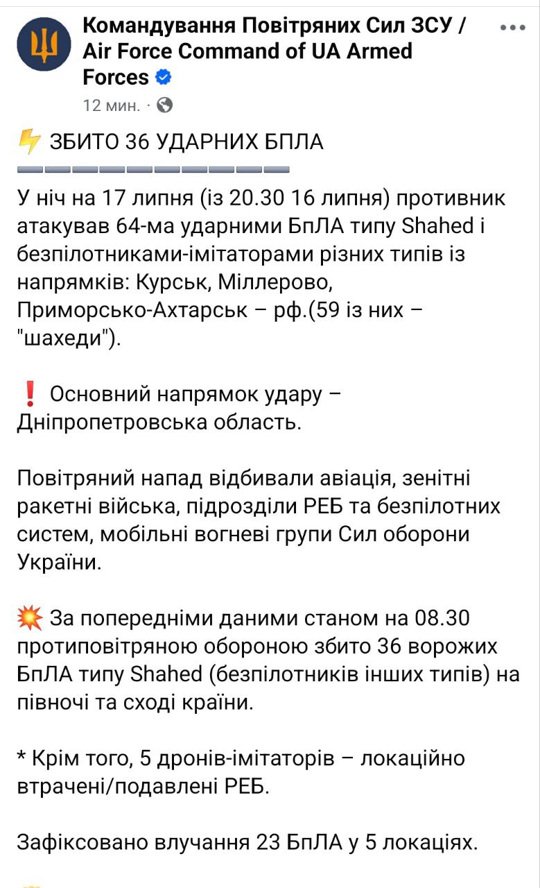 По предварительным данным, к утру сбито 36 "Шахедов" на севере и востоке страны. Еще пять дронов-имитаторов были подавлены средствами РЭБ.