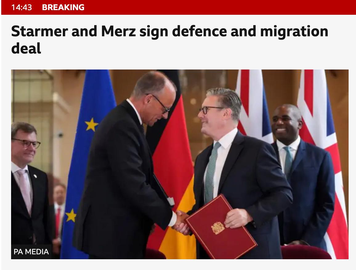 Канцлер Германии Фридрих Мерц и премьер-министр Великобритании Кир Стармер подписали в Лондоне соглашение о сотрудничестве стран. Кроме прочего оно включает обязательства по оказанию взаимной помощи в случае военного нападения.