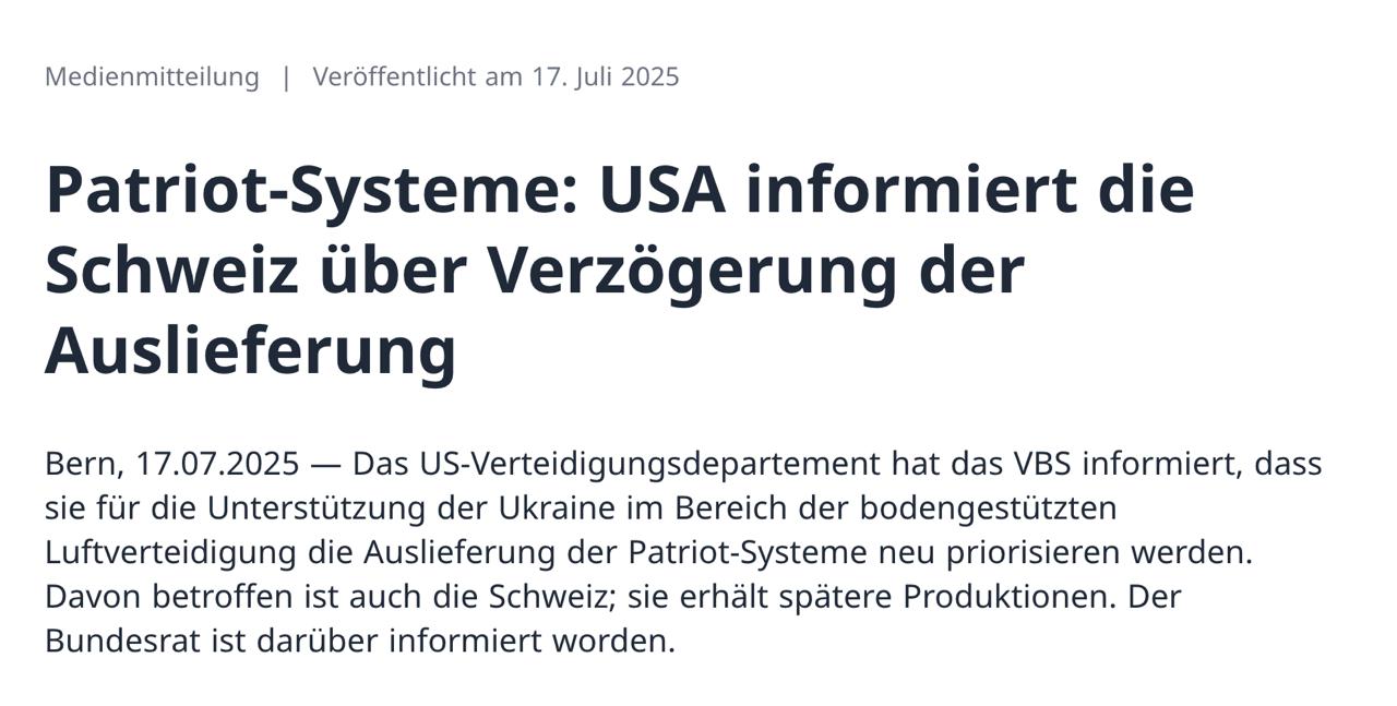 США уведомили Швейцарию о задержке поставок американских комплексов ПВО Patriot из-за приоритетности Украины.