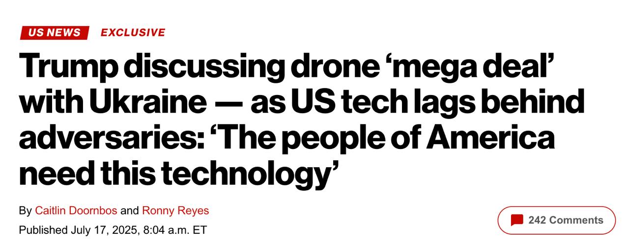 Издание упоминает конкретно дальнобойные дроны, а также пишет, что "Киев предложил поделиться всем, что он узнал о современной войне за три года конфликта с Россией". И отмечает, что "американские технологии значительно отстают от российских и китайских, а американские солдаты плохо подготовлены к использованию БПЛА или защите от устройств, производимых противниками".