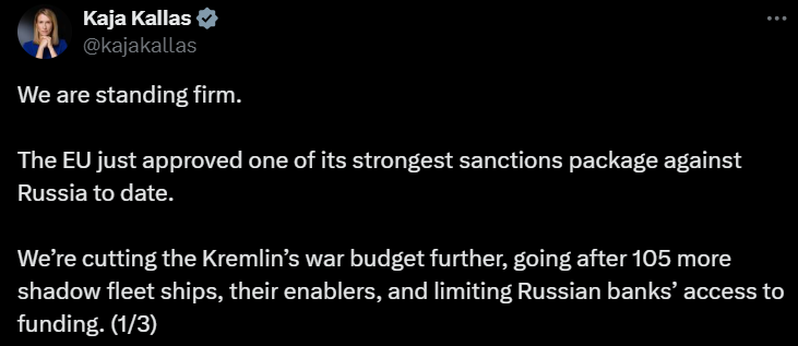 "Мы усиливаем давление на военно-промышленный комплекс России, китайские банки, помогающие обходить санкции, и блокируем экспорт технологий, которые используются в дронах. Впервые мы вводим санкции против реестра судов под флагом страны и крупнейшего нефтеперерабатывающего завода "Роснефти" в Индии", - заявила верховный представитель ЕС.