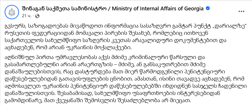 МВД Грузии заявило, что не пускает этих людей на территорию страны в интересах госбезопасности. По информации грузинской стороны, большинство депортированных имеют судимости за тяжкие или особо тяжкие преступления.